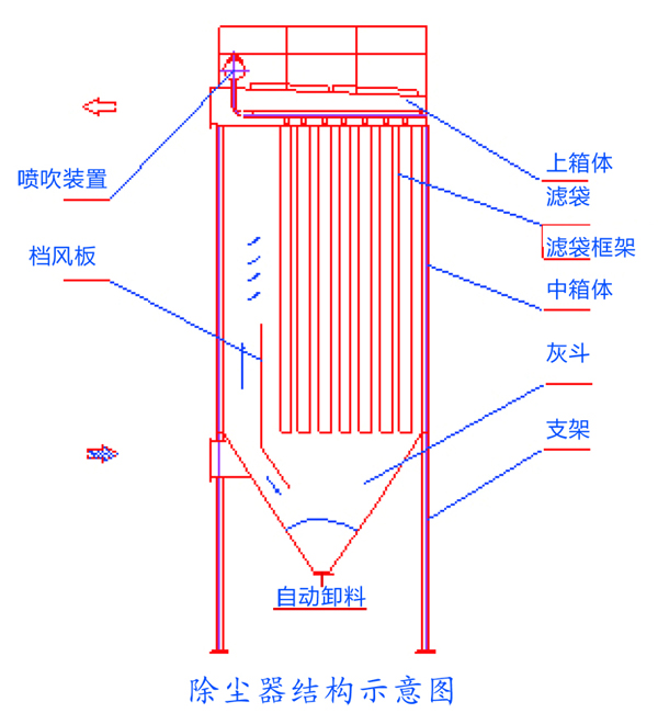 含氣體由灰斗上部進風口進入后,在擋風板的作用下,氣流向上流動,流速降低,部分大顆粒粉塵由于慣性力的作用被分離出來落入灰斗。含塵氣體進入中箱體經濾袋的過濾口進入上箱體,由出風口排出。
